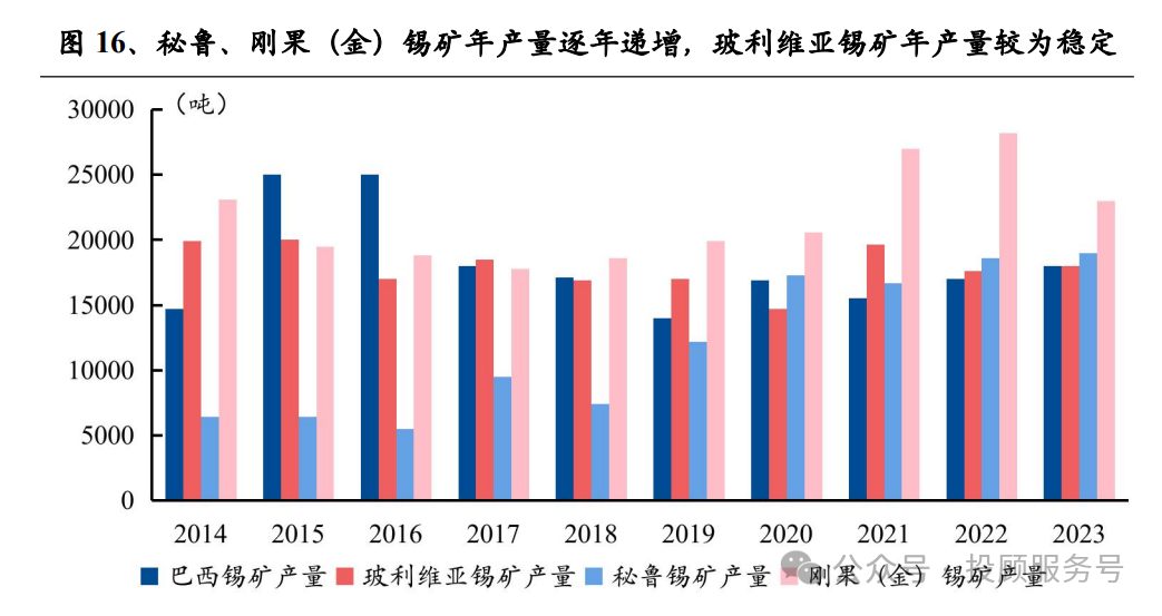 缅甸:2014 年以来,缅甸佤邦地区的低成本锡精矿冲击全球锡市场,使得缅甸成为全球主要产锡国之一,主要以小型矿床为主,生产技术相对落后。缅甸锡精矿主要来源于佤邦曼象矿区,该矿区目前是缅甸境内开采量最大的矿区,此外茂奇和德林达依锡矿带产量较小,受制于较差的基础设施条件和政策制约,短期产量难以提升。自 2019 年起缅甸锡产量明显下跌,主要由于2018 年后缅甸锡矿的过度开采,矿山品位下降使得开采成本提高。此外缅甸佤邦于 2022 年上调关税,并自 2023 年 8 月 1 日后矿山停止一切勘探、开采、加工等作业,目前仍未复产。