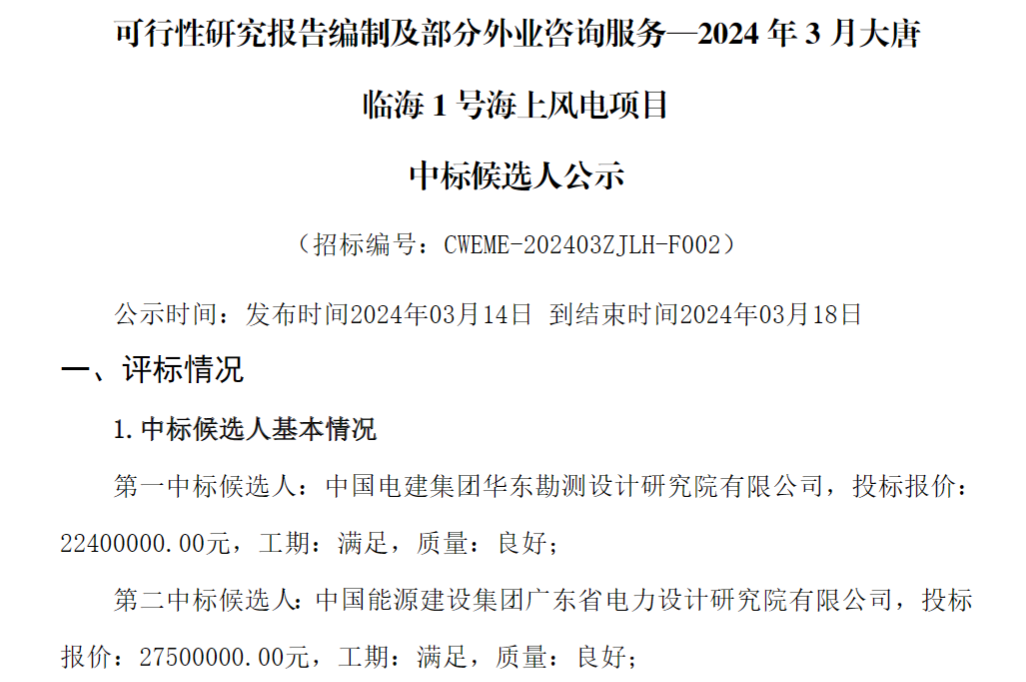 3月14日,大唐电子商务平台发布《可行性研究报告编制及部分外业咨询服务-2024年3月大唐临海1号海上风电项目中标候选人公示》的公告。