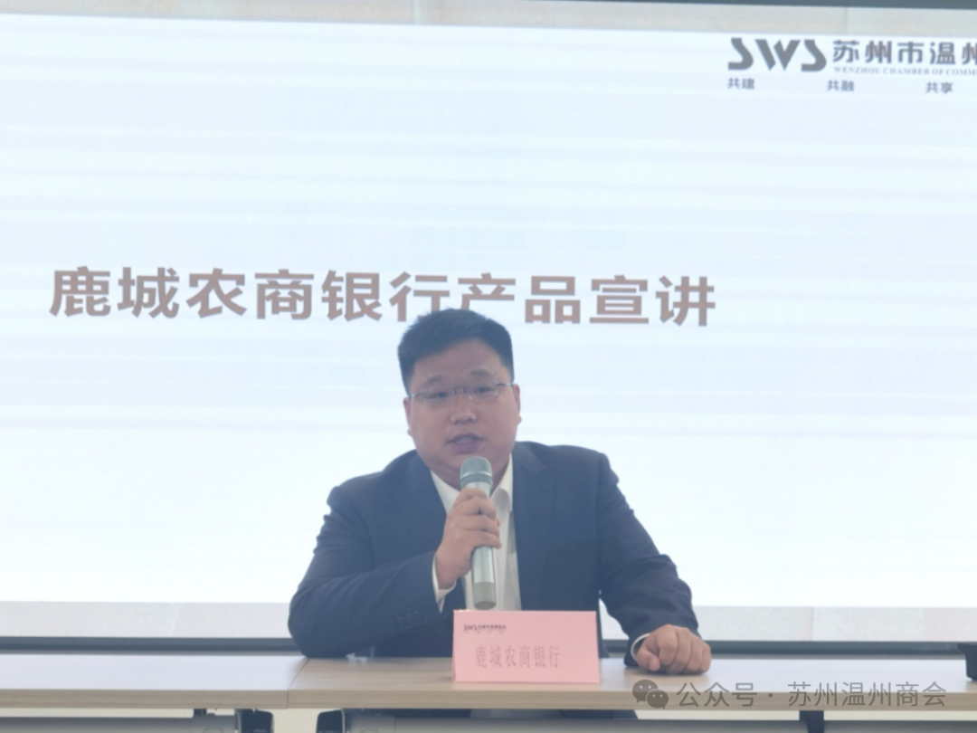 会议最后,来自家乡温州鹿城农商银行的胡金凯经理,向与会会长作了产品宣讲,并表示家乡银行正在不断提升服务效能,希望给更多在苏拼搏的温籍企业带来优质的金融服务。
