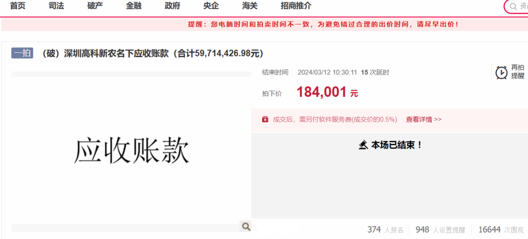 此次拍卖的深圳高科新农技术有限公司名下的应收款,账面金额约5971万元。虽然账面金额巨大,但是起拍价只有1元,而报名参与竞拍更是只要缴纳0.1元保证金就行,门槛非常大。不过竞拍加价幅度则比较高,每次加价幅度最低是1000元。
