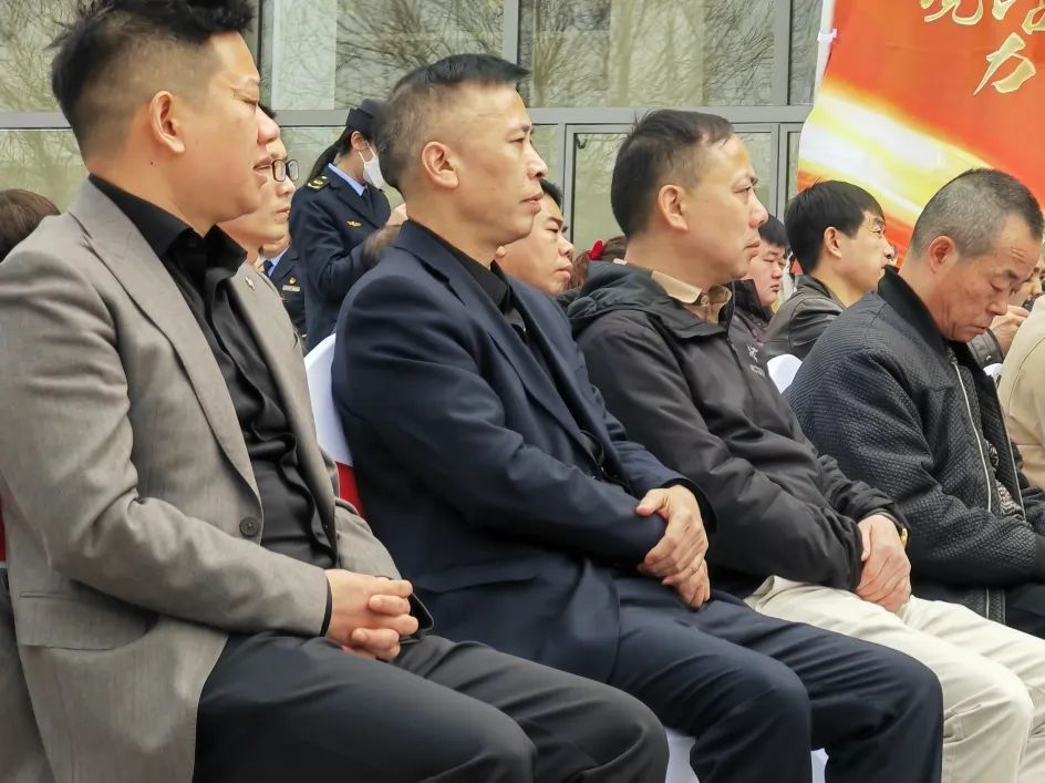 ▲执行会长兼党支部书记杨建国,监事长燕新华与长乐西路街道办王文菁书记、各企业家代表合影