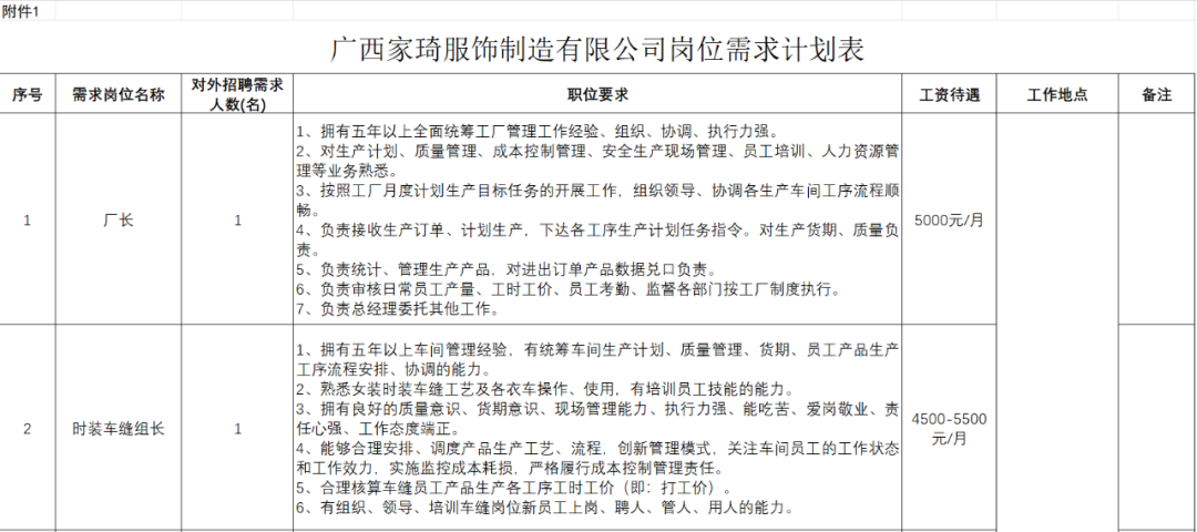 附件:1. 广西家琦服饰制造有限公司岗位需求计划表