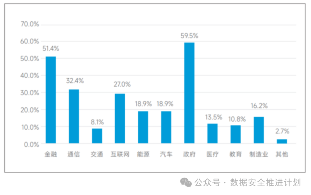 需求侧企业的数据安全需求是推动行业发展的本质因素。随着我国整体数字化水平提升,数据一跃成为众多行业企业的核心生产要素,其安全甚至关乎企业的业务安全以及对数据进行增值分析而带来的衍生价值安全。而随着数据价值的提升,数据窃取、外部供应链泄露、内部数据滥用等数据安全风险激增,政府、企业、个人对数据安全的关注程度广泛提升,各行业对数据安全的需求与日俱增。据统计(见图2),政务(59.5%)、金融(51.4%)等重点行业的数据安全产品和服务的需求较高,促进了数据安全产业的持续发展。