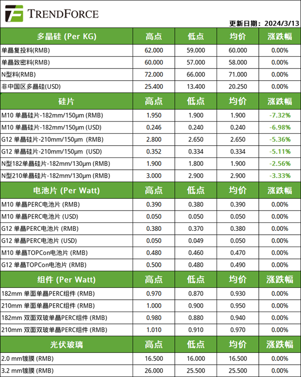 光伏价格:上游环节阶段性供给过剩拖累价格,下游环节奋力推涨仍待时日(2024.3.13)