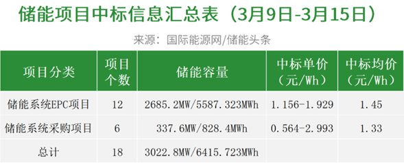 据国际能源网/储能头条对近期(3月9日-3月15日)储能系统EPC/采购招中标项目不完全统计,本周共有招标项目9个,规模合计737.4MW/4233.7MWh,中标项目18个,规模合计3022.8MW/6415.723MWh,招中标规模合计3760.2MW/10649.423MWh。