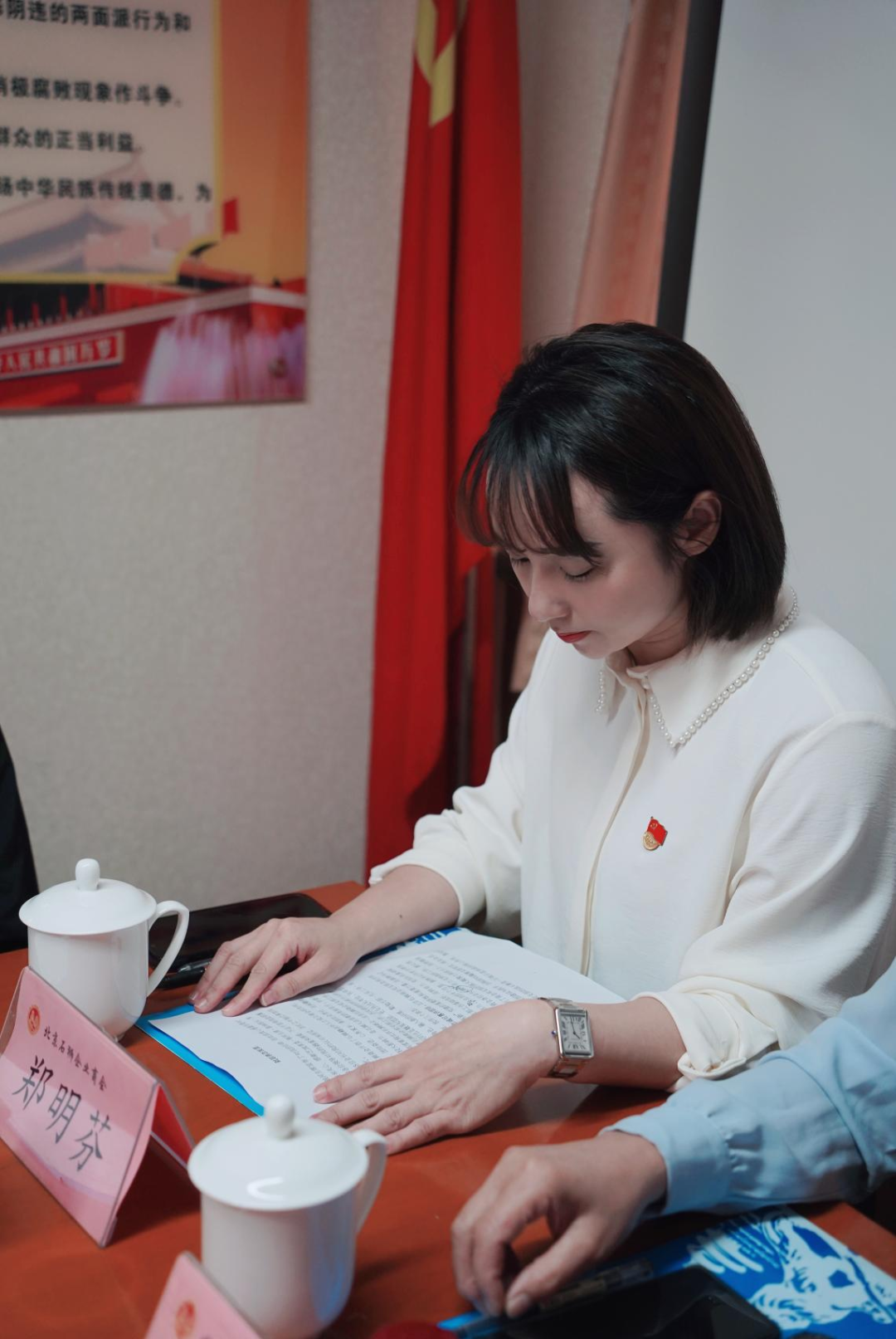 杨新辉同志与郑明芬同志交接印章