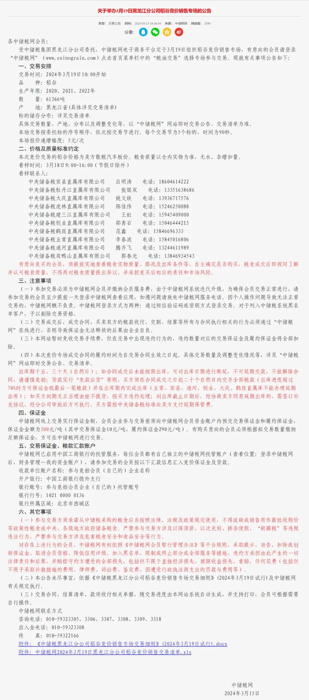 关于举办3月19日黑龙江分公司稻谷竞价销售专场的公告