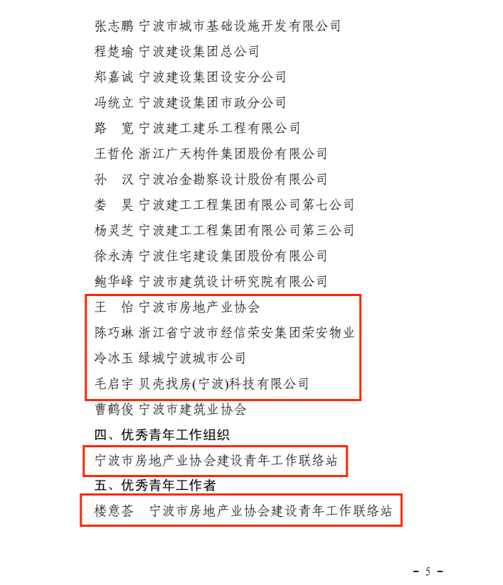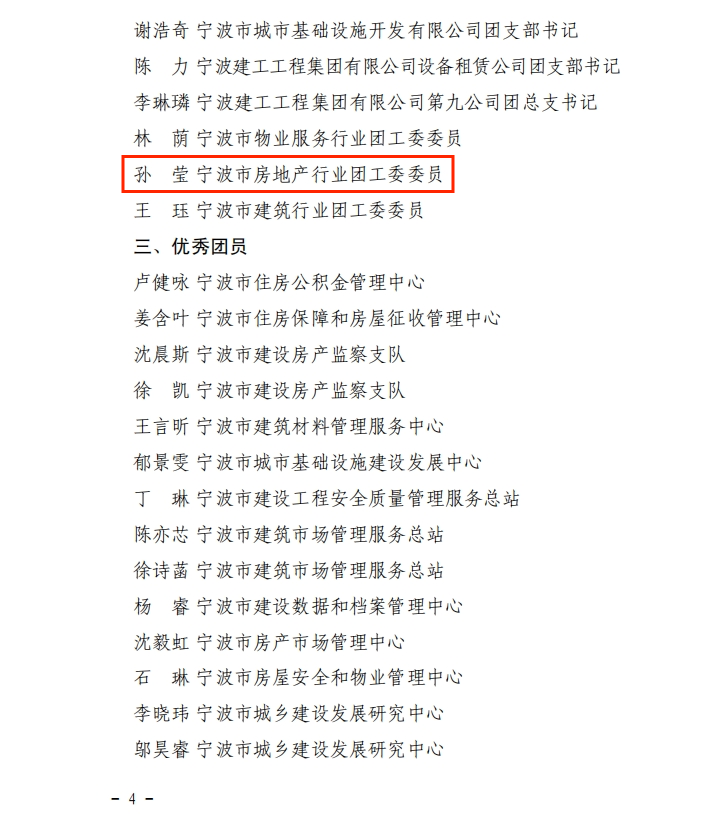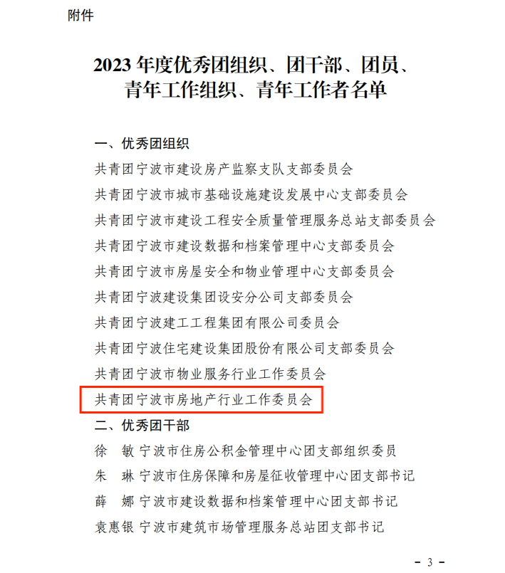 日前,经共青团宁波市委住房和城乡建设工作委员会审定,共青团宁波市房地产行业工作委员会获评“2023年度优秀团组织”荣誉称号;宁波市房地产业协会建设青年工作联络站获评“2023年度优秀青年工作组织”;宁波市房地产行业团工委委员孙莹获评“2023年度优秀团干部”荣誉称号;宁波市房地产业协会王怡,会员单位浙江省宁波市经信荣安集团荣安物业陈巧琳、绿城宁波城市公司冷冰玉、贝壳找房(宁波)科技有限公司毛启宇获评“2023年度优秀团员”荣誉称号;宁波市房地产业协会建设青年工作联络站楼意荟获评“2023年度优秀青年工作者”荣誉称号。
