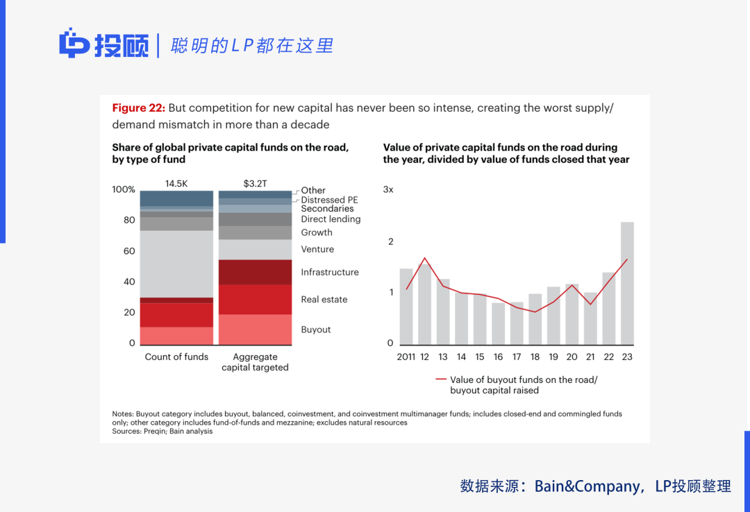 基金对新资本竞争激烈,供需失衡已达到近十年来最严重程度。截至2024年1月,整个行业约14500只基金竞争3.2万亿美元的资本,每2.4美元的募资计划仅能募得1美元。