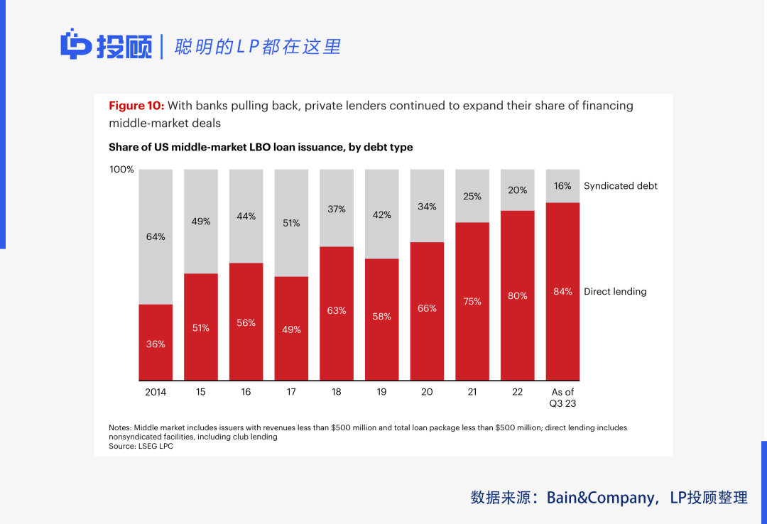 随着银行退出,私人信贷积极填补大银行留下的缺口,扩大在中间市场交易融资中的份额,截至2023年三季度,其所占比例为84%。