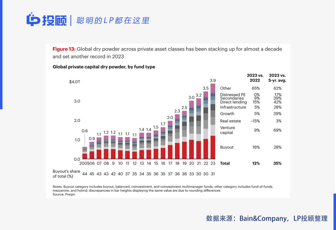 2023年,全球范围内私人资产可投资金创历史新高。总金额为3.9万亿美元,其中,并购基金可投资金达1.2万亿美元。