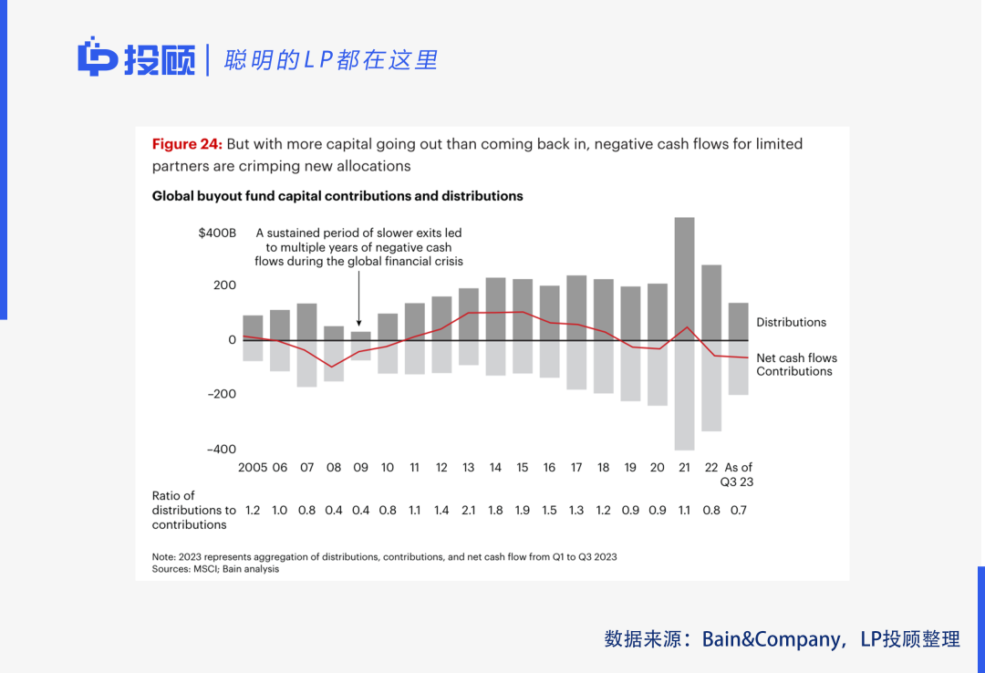 然而,由于未退出资产堆积和DPI滞后,过去五年中,LP有四年的现金流为负,新的投资也被限制。