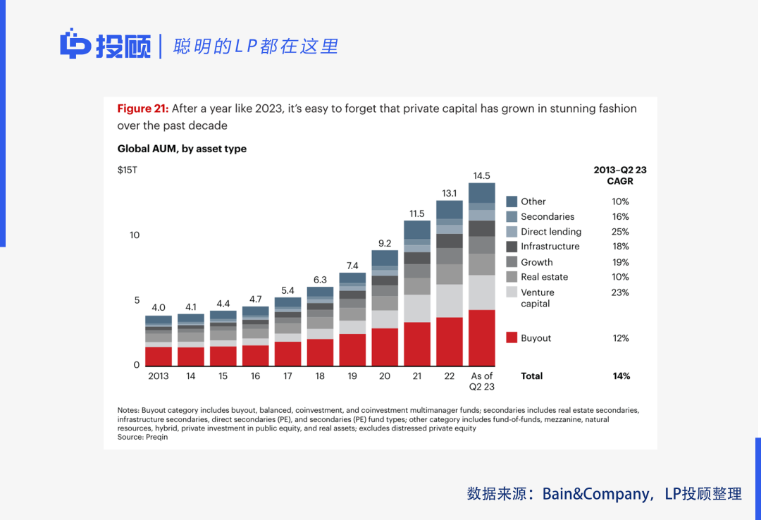 过去十年内,私人资本的飞速增长催生了一个高度多元化的行业,截至2023年2季度,总管理资产规模已达14.5万亿美元。