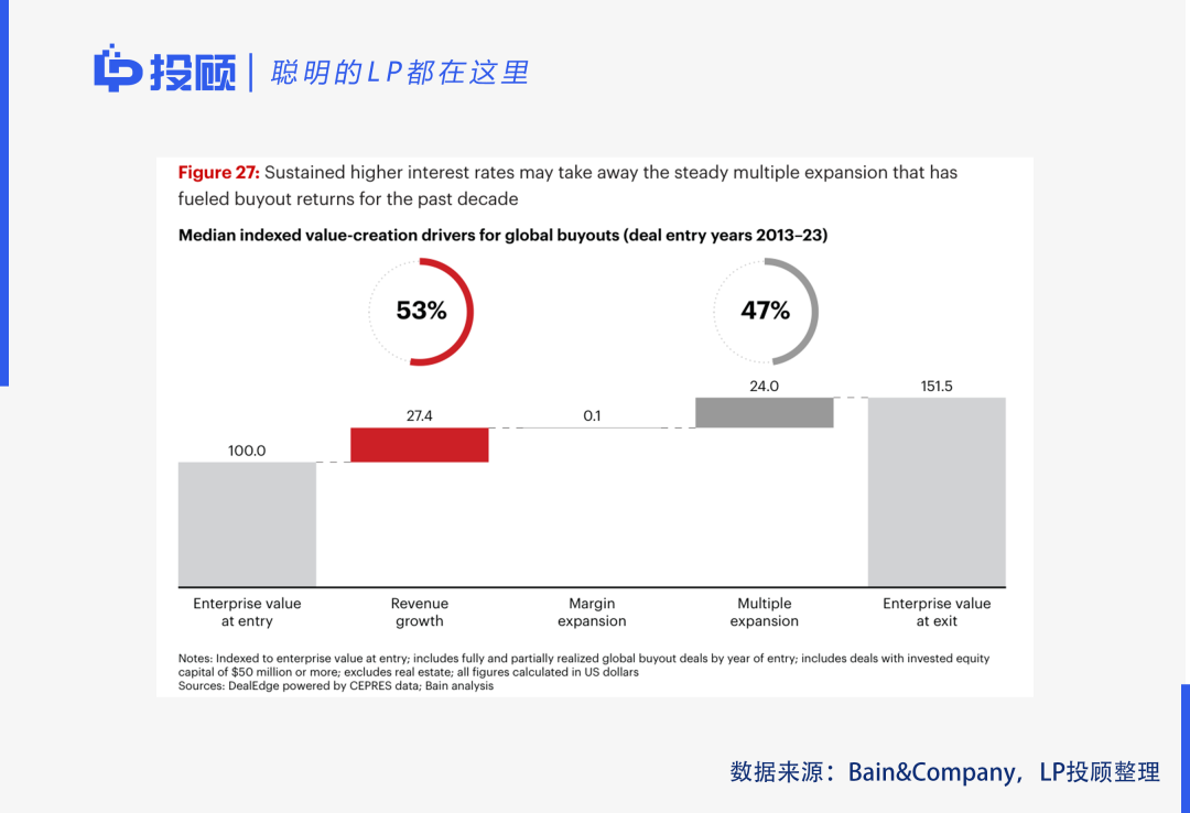 过去十年间,并购基金基本忽略了利润率增长对价值的驱动,并一直通过多重扩张来实现。在利率持续高升时期,GP在维持业绩时可能会在价值创造方面提高水平。