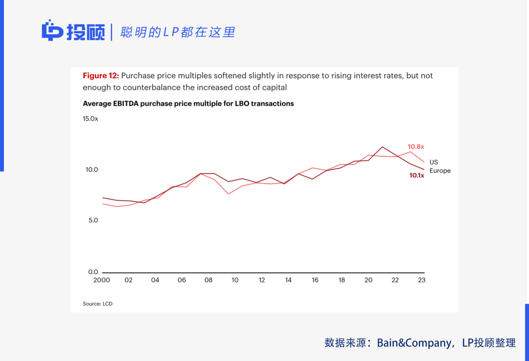 购买价格对EBITDA的倍数方面,美国接近11x,欧洲约为10x,因利率上升,该倍数有所下降,但仍不足以抵消资本成本的增加。