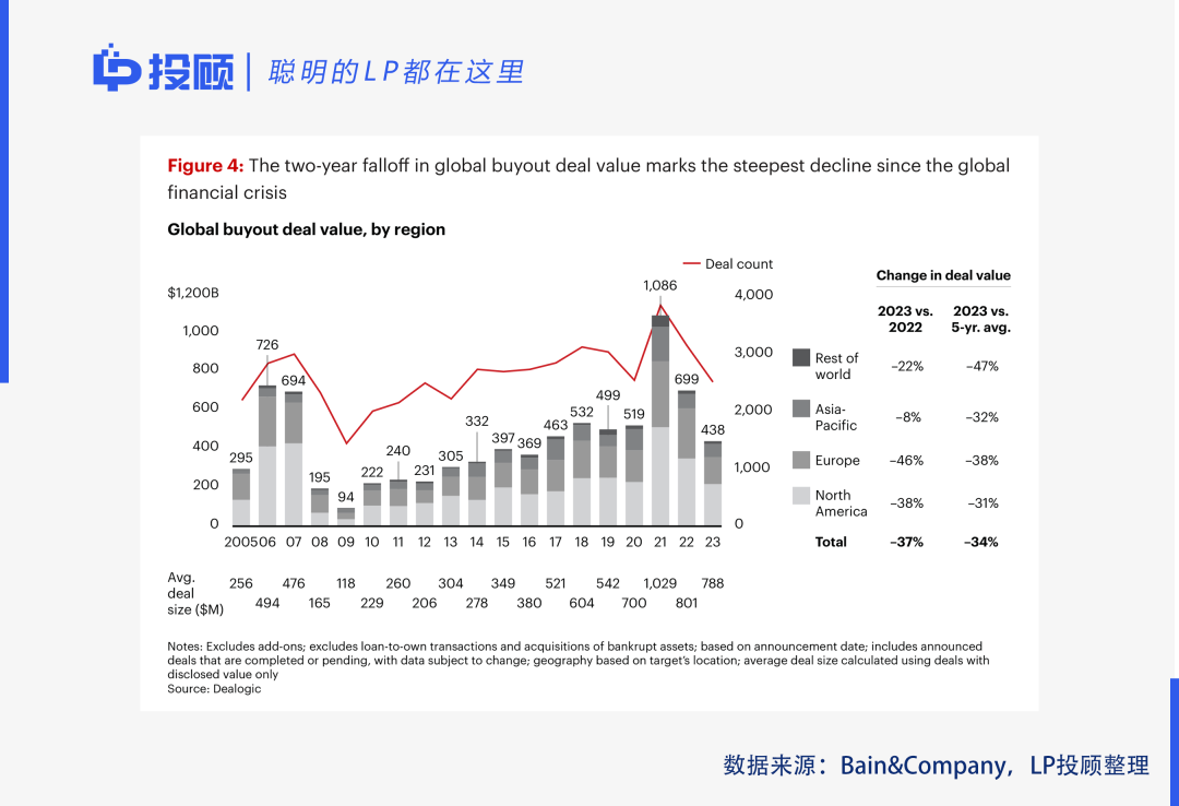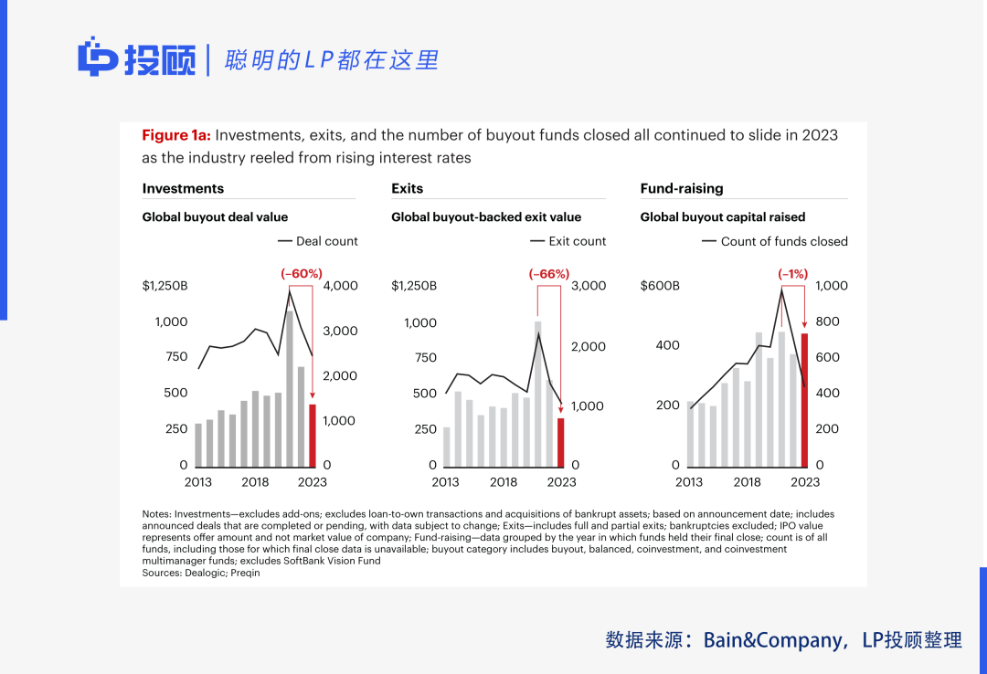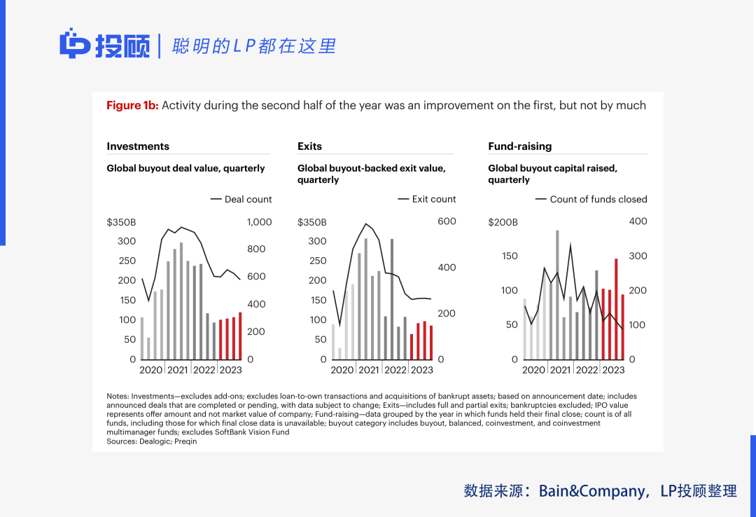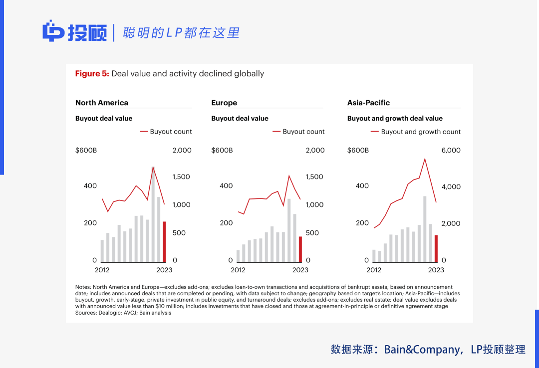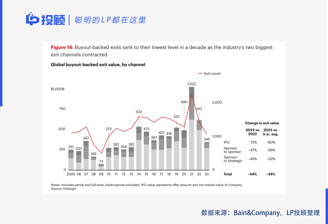 在利率上升、宏观不确定性影响下,买卖双方在估值上存在分歧,2023年退出的表现甚至比投资交易更糟。