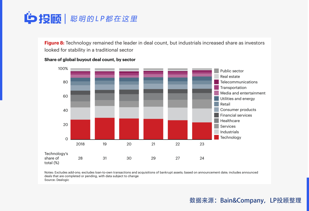 科技行业交易对杠杆的需求较小,因而在收购总数中占据领先地位。但随着投资者偏好传统行业的稳定性,工业行业的份额有所增加。