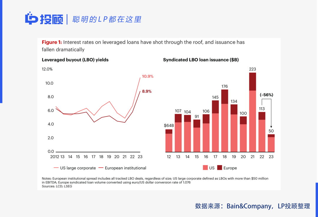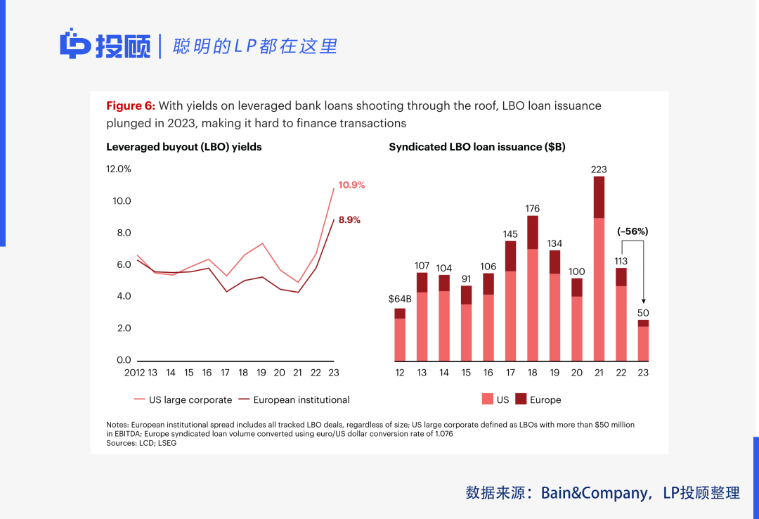 各种交易均受到影响,其中依赖银行融资的交易所受影响最大。随着杠杆收购收益率飙升,2023年杠杆收购贷款发行量大幅下降,降幅为56%。