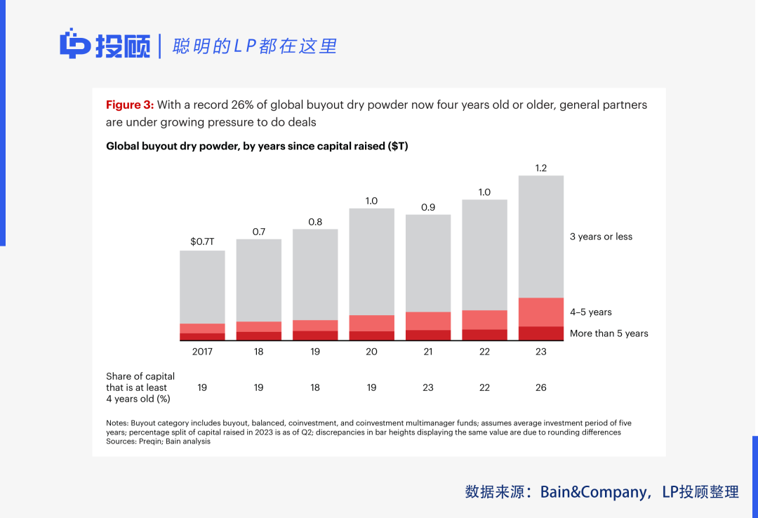 2023年,并购基金的可投资金1.2万亿美元,创近七年内历史最高记录,其中26%的资金已募集四年或四年以上,高于2022年的22%,GP面临越来越大的交易压力。