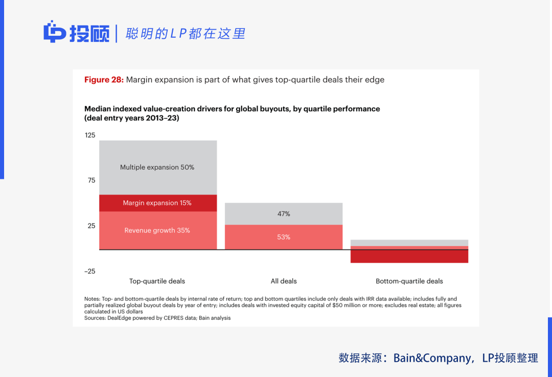 尽管排名前四分之一的交易也依靠倍数扩张来实现公司价值的上升,但利润率改善的作用比普通基金要大得多,利润率扩张成为其交易优势的一部分。