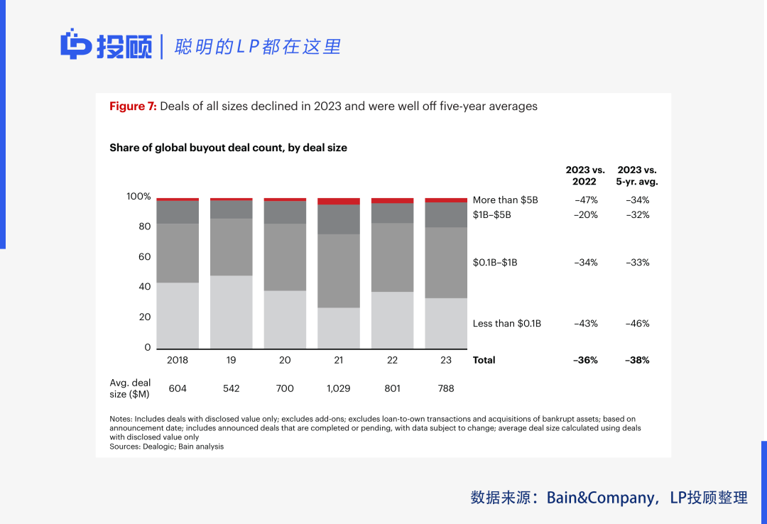 2023年,各种规模的交易均出现下降,且远低于近五年平均水平。由于可负担的杠杆缩减,大型交易(超过50亿美元)数量相较于2022年减少了近一半,平均规模从2021年10.29亿美元的峰值降低至7.88亿美元。
