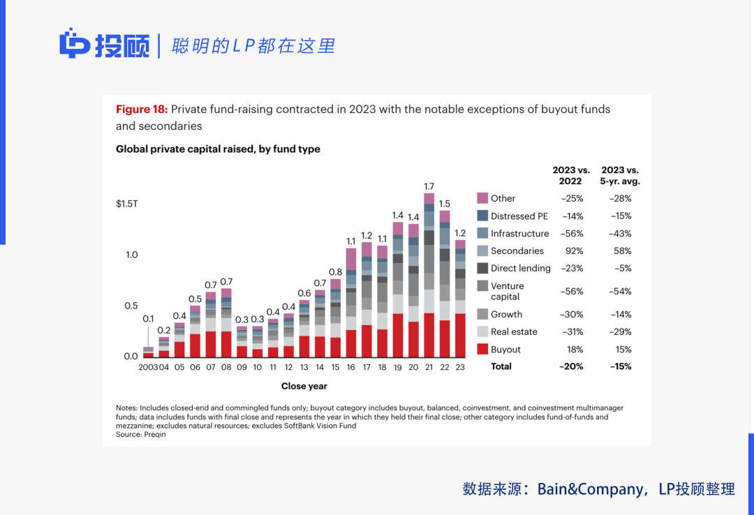 2023年是该行业自2018年以来募资水平最低的年份,总募资额为1.2万亿美元,比2022年减少20%,比2021年减少近30%。