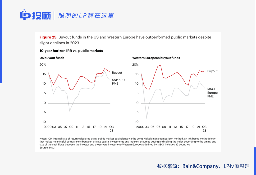 2021年以来,美国、西欧的并购基金10年期IRR虽小幅下降,但该行业表现仍旧优于同时期的公开市场,这种优秀的表现持续了一年多时间。