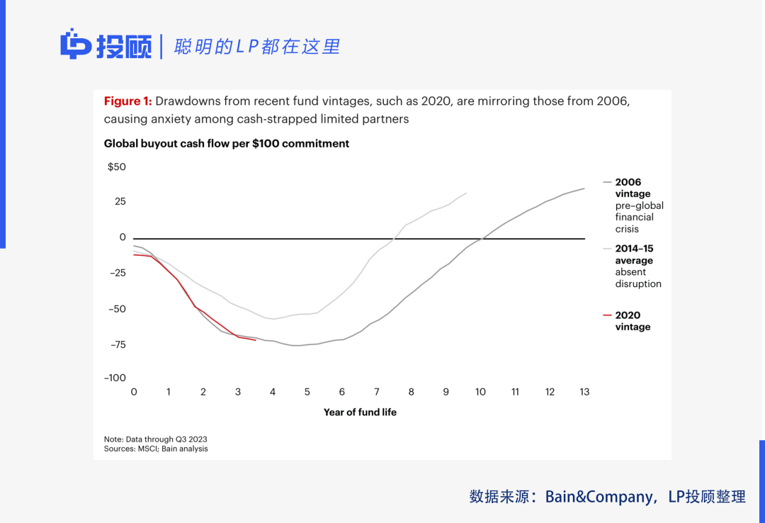 大多数基金现金流都遵循“J曲线”效应,通常并购基金成立7年后产生超过原始资本的分配,而近期(2020年附近)成立的基金与2006年情况相似,预期需要更长时间才收回投资,LP为此感到焦虑。
