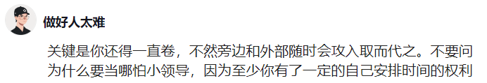有网友说:关键是你还得一直卷,不然旁边和外部随时会攻入取而代之。不要问为什么要当哪怕小领导,因为至少你有了一定的自己安排时间的权利