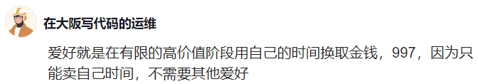 有网友说:爱好就是在有限的高价值阶段用自己的时间换取金钱,997,因为只能卖自己时间,不需要其他爱好