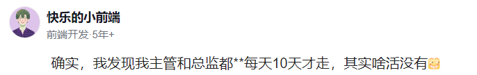 有网友说:确实,我发现我主管和总监都**每天10天才走,其实啥活没有
