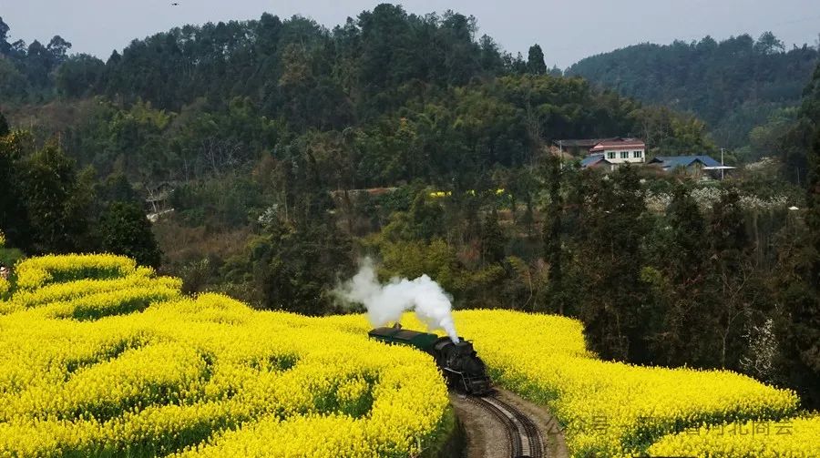 点正,大家坐上了嘉阳蒸汽小火车,开始了约一个小时的穿越花海之旅。车厢里,大家欢声笑语,其乐融融。既观赏了窗外满山遍野的油菜花,也亲身体验了蒸汽时代这种古朴的运输产物。小火车时快时慢,机车烧煤,全靠人工操作。每到最佳观景点和拍摄地点,列车员叫乘客下车,集体观看小火车蒸汽喷汽表演。喷汽的场景,令人赏心悦目,大家忍不住拍照留念。