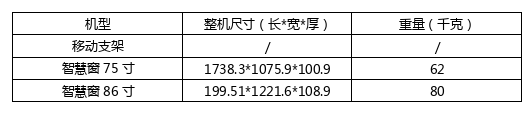 发货包装若需打木架运费需要增加400元/台,费用由借机方承担。4.签署协议后,后续将由智慧皆成公司人员联系确认借机事宜并最终安排发货。5.所有借机将会在4月18日到达本次展会现场,由智慧皆成公司统一签收后,专人联系到指定地点进行领取( 样机到达日期如因展会时间调整,将另行通知);展会期间, 借用大屏的包装箱需自行保管, 并在展会结束后根据产品序列号依次包装后归还, 如有损坏将照价赔偿。6.智慧皆成公司将会对借用产品的安装与使用提供指导,现场需借用方自行安装。安装操作简易,需配备基本工具,如扳手、螺丝刀等。如挂墙展示需提前考虑墙面承重能力。7.关于借机前期如有其它疑问,可联系:董梦瑶18756159903(微信同号)、毛雅欣18855115528(微信同号)三、智慧窗产品基本参数