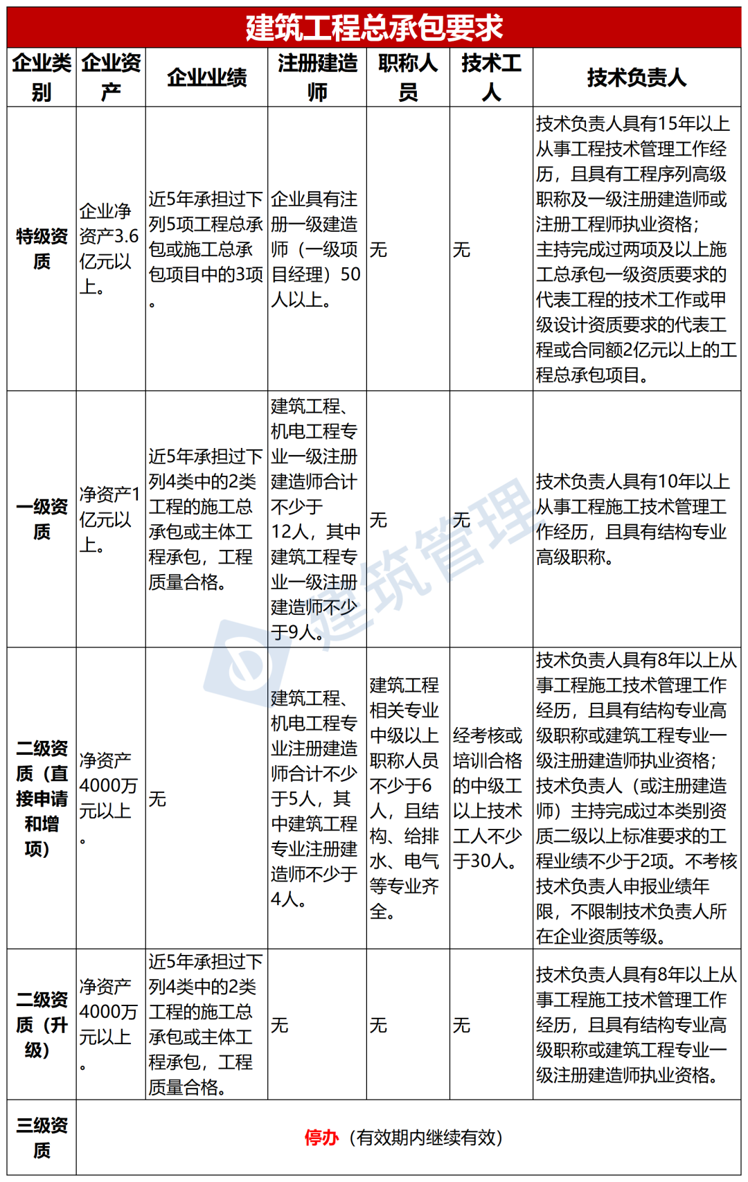 本文将根据最新政策对各类施工总承包企业资产、企业业绩、人员要求及资质中职称人员学历、职称相近专业要求解析进行详细汇总,供读者参考