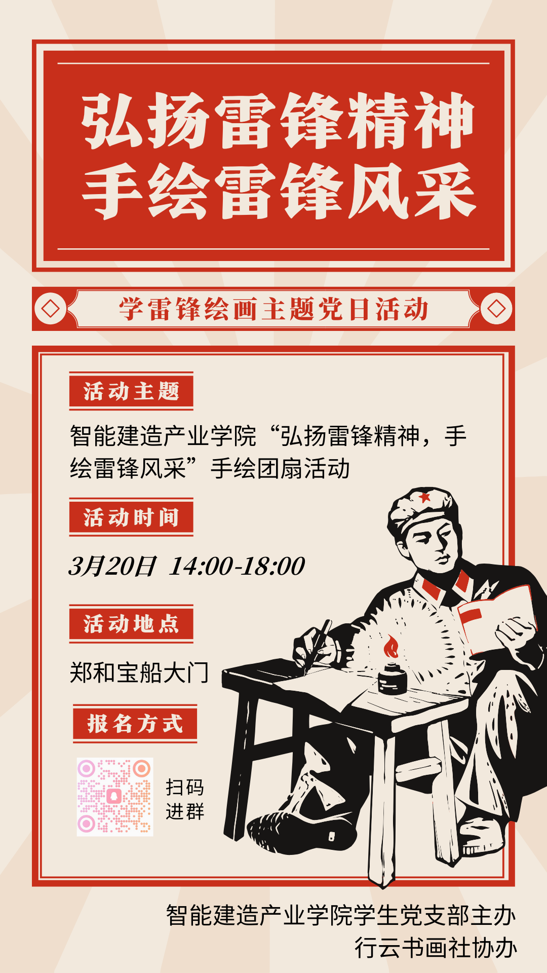 为进一步弘扬雷锋精神,传承和发扬中华民族传统美德,提升广大青年学生的思想道德水平,构建和谐社会。智能建造产业学院学生党支部与行云书画社将于2024年3月20日14:00-18:00在郑和宝船大门举办“弘扬雷锋精神,手绘雷锋风采”手绘团扇党日活动。