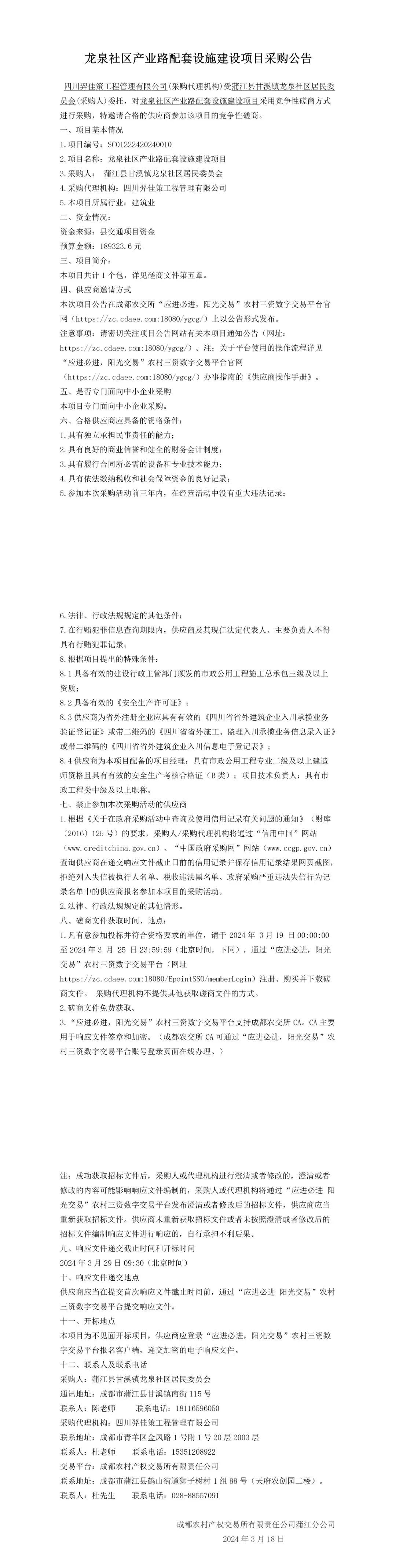 龙泉社区产业路配套设施建设项目采购公告