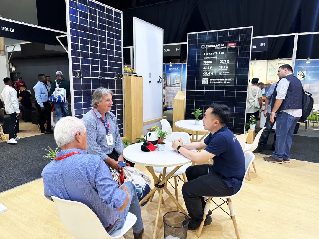 云程光伏此次携多款天耀N型Topcon系列组件亮相南非。其中,展出了双玻N型705W组件,该组件使用 210 * 210 规格的电池片,组件效率达到22.7%,是云程N型Topcon技术中功率最大的组件,主要运用于大型地面电站项目。