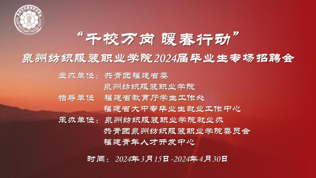 为全面贯彻落实党的二十大精神、落实习近平总书记重要指示精神和党中央、国务院关于“稳就业”“保就业”决策部署,落实教育部《关于做好2024届全国普通高校毕业生就业创业工作的通知》文件精神,搭建毕业生与用人单位双向选择交流平台,更好地为高校毕业生提供持续就业服务,促进高校毕业生充分就业,福建青年人才开发中心、泉州纺织服装职业学院决定联合举办“千校万岗 暖春行动”2024届毕业生网络招聘会,诚挚邀请贵单位参会招贤引才。