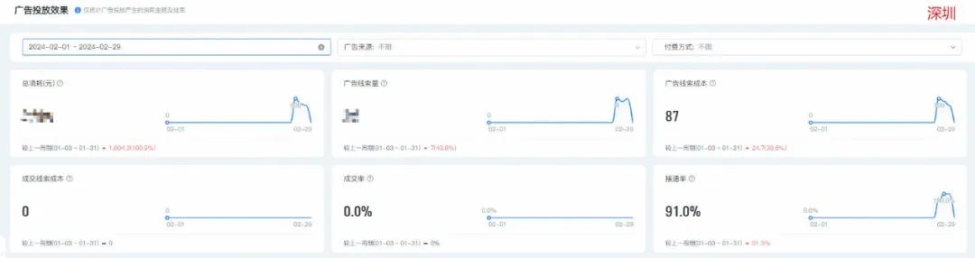 深圳的线索成本87元,推广律师费类,上量很快,流量充足的很。