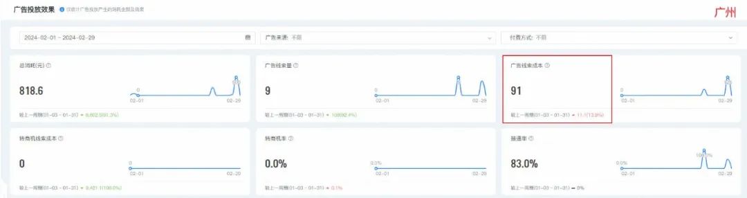 广州的线索成本91元,推广综合类,年龄定向为24岁+。