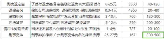 我之前熊厂的同事,发来了法律行业的获客成本,这个成本和我们实际推广的成本比较接近。