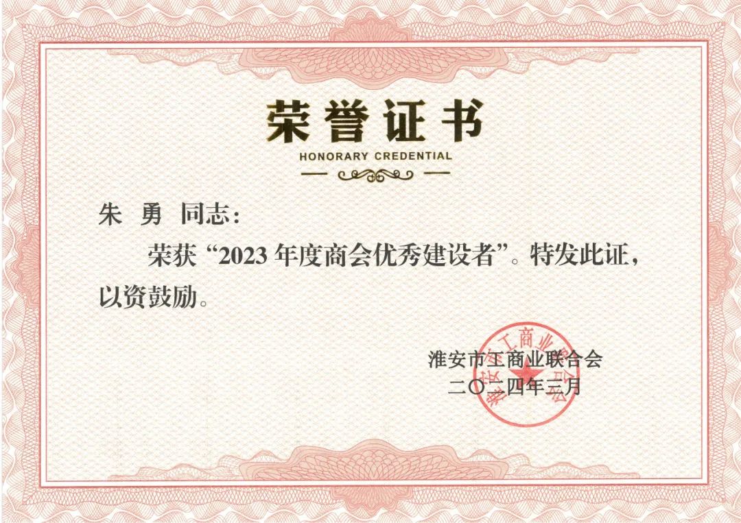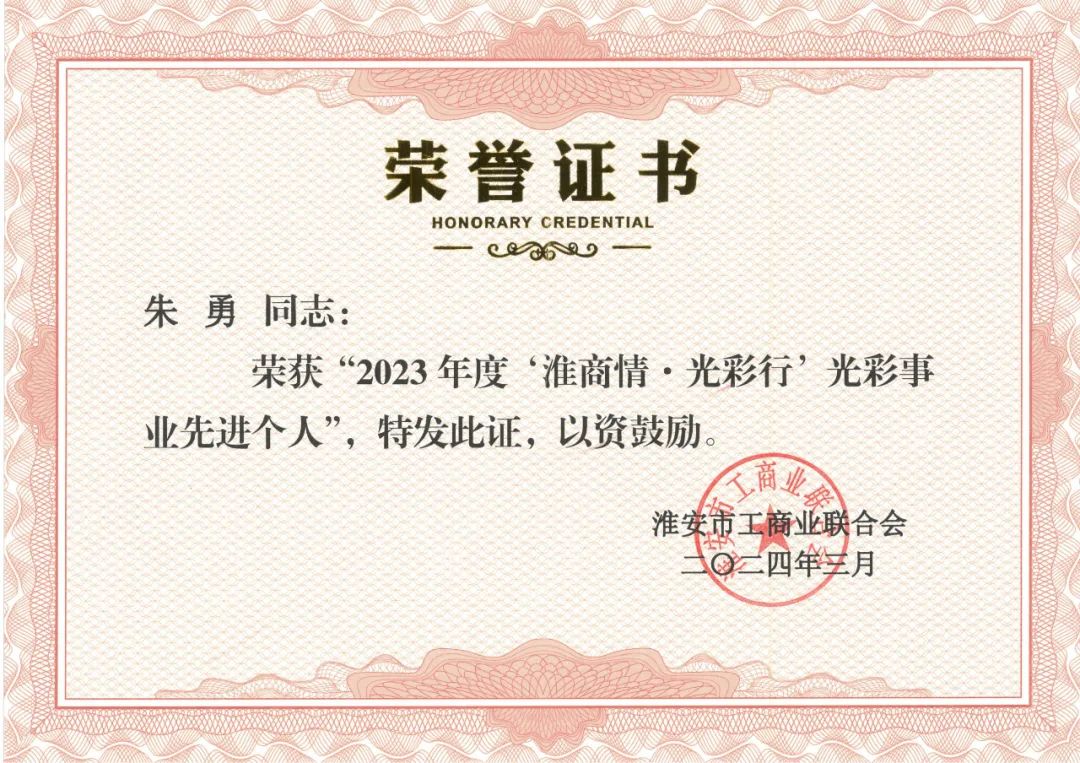 会议隆重表彰了一批优秀商会和先进个人,这些获奖者不仅在各自的领域内取得了显著成绩,也为商会的发展做出了积极贡献。淮安市科技企业商会会长朱勇荣获“2023年度商会优秀建设者”和“2023年度‘淮商情-光彩行’光彩事业先进个人“光荣称号。