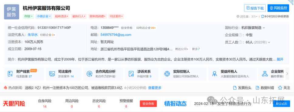 伊裳服饰有限公司法定代表人是朱华水,2006年他曾成立杭州市江干区娱和图文设计工作室,目前的经营状态为注销。2014年朱华水还成立了衣纳芙服装有限公司,天眼查显示2017年该公司已注销。
