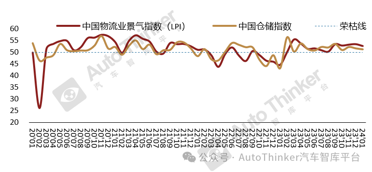 中国物流与采购联合会发布的2024年1月份中国物流业景气指数为52.7%,较上月回落0.8个百分点;中国仓储指数为51.2%,较上月回落0.4个百分点。