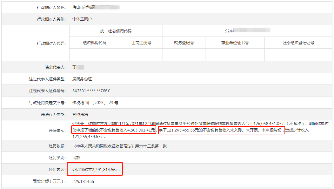 杭州服饰公司逃税被罚3.6亿近日,国家税务总局浙江省税务局发布信息,杭州伊裳服饰有限公司逃避缴纳税款。经查,该公司在2014年01月至2021年06月期间,不缴或少缴应纳税款21237.93万元。这次倒查7年,突破了过去倒查3年的惯例。依据相关法律规定,国家税务总局杭州市税务局第三稽查局对其处以追缴税款21390.99万元的行政处理、处以罚款14866.55万元的行政处罚。也就是说,加上补缴和罚款金额,该公司被罚总金额达到3.6亿。税务部门这一严惩偷税行为的举措,给电商行业商家们敲响了警钟。税务不合规的商家,势必会被重罚。谈到这家杭州服饰公司,它成立于2009年,以从事纺织服装、服饰业为主。大股东为李燕飞,法定代表人系朱华水,公司注册资本100万元,实缴资本为30万元。天眼查显示,朱华水曾在2006年成立杭州市江干区娱和图文设计工作室,又于2014年成立了衣纳芙服装有限公司,目前两者的经营状态均为注销。2018年5月,伊裳服饰董事长朱华水曾在“创创营销”举办的17期重构未来活动中表示:“我的品牌是‘伊纳芙’,英文名inlife,目前我公司一年的净回款4个亿左右。”紧接着2022年5月,杭州伊裳服饰有限公司把inlife品牌转让给杭州秋谷服饰有限公司,股东叫李燕龙、李燕波。值得关注的是,杭州伊裳服饰只转让了品牌,却没有注销公司,或许是接到税务调查通知后才进行主体变更,为了逃避税务责任和税务处罚,选择转让品牌以规避潜在风险。就在两个月前,杭州伊裳服饰有限公司被杭州市临平区人民法院列为被执行人,执行标的60.9万元。一波未平一波又起,其公司法定代表人、执行董事兼总经理朱华水今年2月1日又被杭州市临平区人民法院限制高消费。2月21日,朱华水从股东中退出。目前来看,3.6亿的罚款确实是一个巨额数字,它不仅是对单个企业税务违法行为的严厉惩罚,更是税务部门对所有企业发出的明确警示。通过让逃税行为承担高昂的成本,税务部门试图传达出一个清晰的信息:逃税不仅会带来经济上的巨大损失,还会严重影响企业的声誉和长期发展。随着电商行业的规模不断扩大,尤其是直播电商的迅猛发展,让不少商家和主播挣到了钱。据艾瑞咨询数据,2023年,中国实物商品网上零售额达到13.0万亿元,增速为8.4%,同时中国直播电商市场规模达到4.9万亿元,同比增速为35.2%。电商行业持续发展之下,偷税漏税的主播和商家不在少数。多年来,电商受到政策保护,监管宽松,很多中小商家心存侥幸,刷单成风,而直播电商更是成为偷税漏税的重灾区。常在河边走,怎能不湿鞋。随着监管趋严,偷税偷税的主播和商家们要面临逃税被罚的压力。去年7月,税务局公告信息显示,佛山一服饰店(个体工商户)被税务局稽查并罚款 229 万元。经检查,该服饰店在一年期间仅申报了增值税不含税收入480.3万元,而隐藏的收入高达1.21 亿元。同样在去年,税务局公告信息称,广州市某化妆品有限公司在2018年通过网络销售平台销售货物,取得含税销售收入合计1.12亿元,但并未按规定申报缴纳增值税、城市维护建设税、企业所得税等税款,被处罚837.33万元。带货主播偷税漏税的行为更是屡见不鲜。其中引起强烈反响的就有薇娅、雪梨等头部主播的偷逃税行为。2021年,浙江省杭州市税务局稽查局查明,薇娅在2019年至2020年期间,通过隐匿个人收入、虚构业务转换收入性质虚假申报等方式,偷逃税款6.43亿元,其他少缴税款0.6亿元。最终被追缴税款、加收滞纳金并处罚款,共计13.41亿元。紧接着后续,薇娅在淘宝、抖音、微博等多个平台的账号被封。同年,网红主播朱宸慧(雪梨)、林珊珊在2019年至2020年期间,通过虚构业务把从有关企业取得的个人工资薪金和劳务报酬所得8445.61万元,转换为个人独资企业的经营所得,偷逃个人所得税3036.95万元。最终被追缴税款、加收滞纳金并拟处1倍罚款,共计6555.31万元。同时,雪梨也被全网封杀。去年11月份,在抖音拥有80多万粉丝的时尚穿搭博主王纯善,因偷逃个人所得税218.30万元、增值税142.41万元,被追缴税款、加收滞纳金并处罚款,共计653.61万元。受此次事件影响,该博主抖音账号也转为私密账号。近日,国家税务总局河南省税务局稽查局发现,网络主播马海涛、梁娜夫妻二人涉嫌偷税,其拥有的千万粉丝抖音账号也已被封禁。从薇娅、雪梨这些头部主播的偷逃税方式看,他们要么是虚假申报,或者通过转换性收入的方式来实现非法避税,而偷逃税最终结果只会是全平台封禁,并且加大罚款力度。从2021年首次曝光网络主播偷逃税案以来,税务部门就对电商企业和网络主播偷逃税行为愈发关注。各地税务机关加强对逃税行为的监管和打击,提高了违法成本,有助于规范行业秩序,促进行业健康有序发展。不论从行业健康发展还是维护市场公平来看,电商行业监管的加强是大势所趋。近期,格力电器董事长兼总裁董明珠谈到,线上销售必须实名纳税,加强对直播电商行业的纳税管理和监督,以维护市场秩序。如果不加以规范,将会扰乱市场,给实体经济和优秀企业带来严重的伤害。这突出了董明珠对电商实名纳税的重视,是对电商行业的一次重要规范。如今,国家对企业营收进行严格筛查和监管的趋势日益明显,而电商行业成为2023年税务稽查重点之一。据了解,从2022年第四季度至今,广东、上海、浙江、河南、山东等地,已经有不少电商企业被查。涉税订单流水多在5000