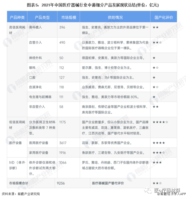 总体来看,中国医疗器械行业整体国产替代发展相对较弱,尤其在高值医用耗材领域,国产替代程度整体相对较低,是医疗器械领域国产替代“洼地”,相关细分产品发展现状如下: