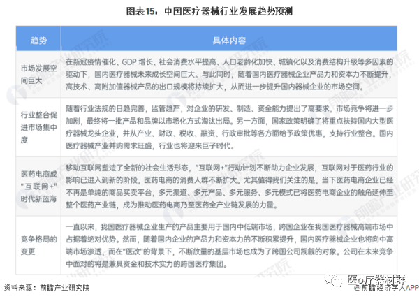 相比发达国家,我国医疗器械行业具有起步晚、规模小、产品单一的特点。但经过近几十年的快速发展,现我国医疗器械行业已成为一个产业门类比较齐全、创新能力不断增强、市场需求旺盛的朝阳产业。随着国家政策支持与优化、医改不断深入、人口老龄化不断凸显、消费能力和健康意识提升,促使我国医疗器械行业尤其是国内医疗器械龙头企业进入了黄金发展时期。而国内高歌猛进的医疗器械市场,在兼具资金和技术优势的国际医疗巨头的青昧下,行业竞争激烈,机会与挑战并存,未来中国医疗器械或有以下发展趋势: