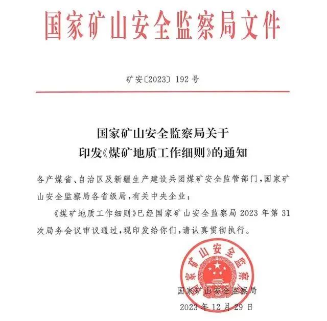 修订后的《煤矿地质工作细则》于2024年3月1日正式施行,请各地煤矿安全监管监察部门、煤矿企业认真贯彻执行。
