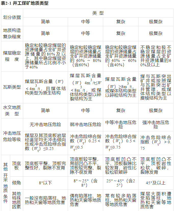 第十条 井工煤矿应根据地质构造复杂程度、煤层稳定程度、瓦斯类型、水文地质类型、冲击地压危险等级和其他开采地质条件进行类型划分。井工煤矿地质类型分为简单、中等、复杂和极复杂4种类型(表2-1)。