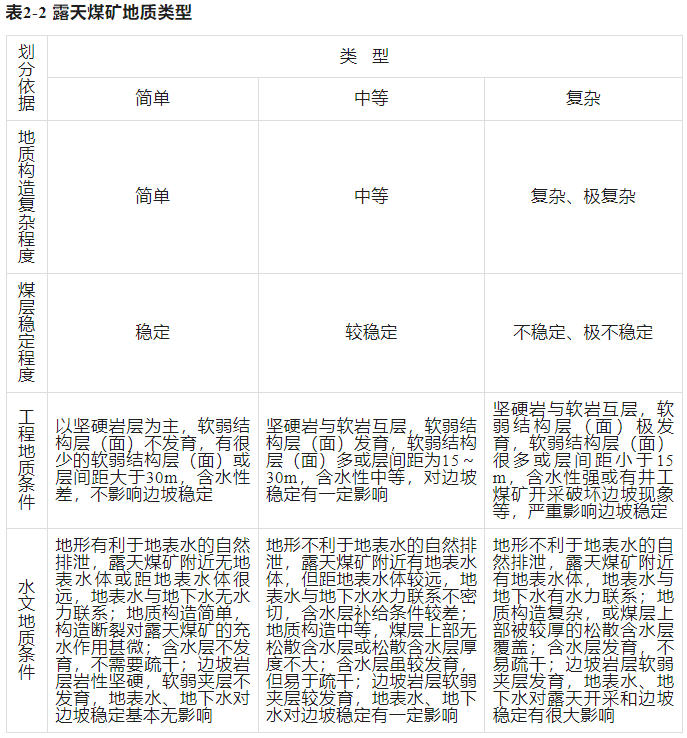 6. 按划分依据就高不就低的原则,确定井工煤矿地质类型。露天煤矿应根据地质构造复杂程度、煤层稳定程度、工程地质条件和水文地质条件进行类型划分。露天煤矿地质类型分为简单、中等和复杂3种类型(表2-2)。